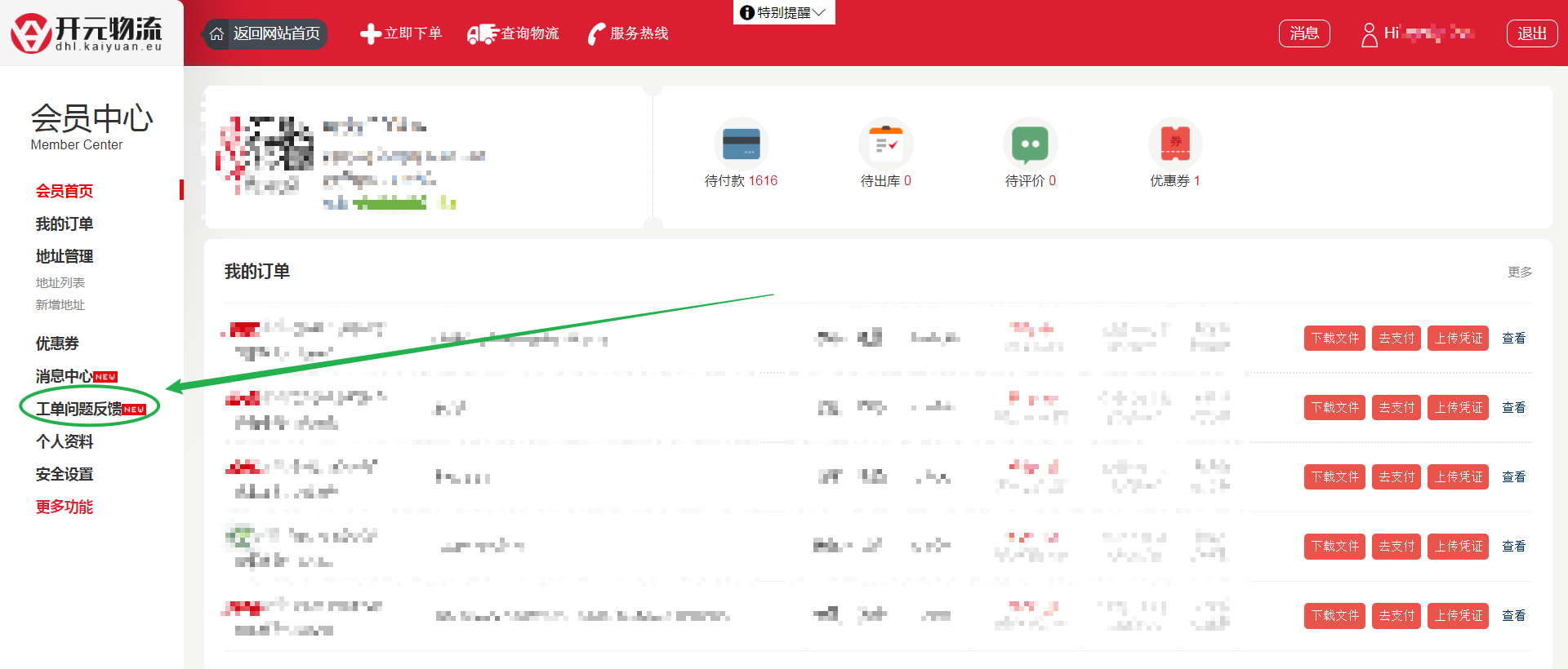 1. 登陆您的账号,打开“会员中心”,可看到如下页面。在左侧菜单栏找到“工单问题反馈”并点击;