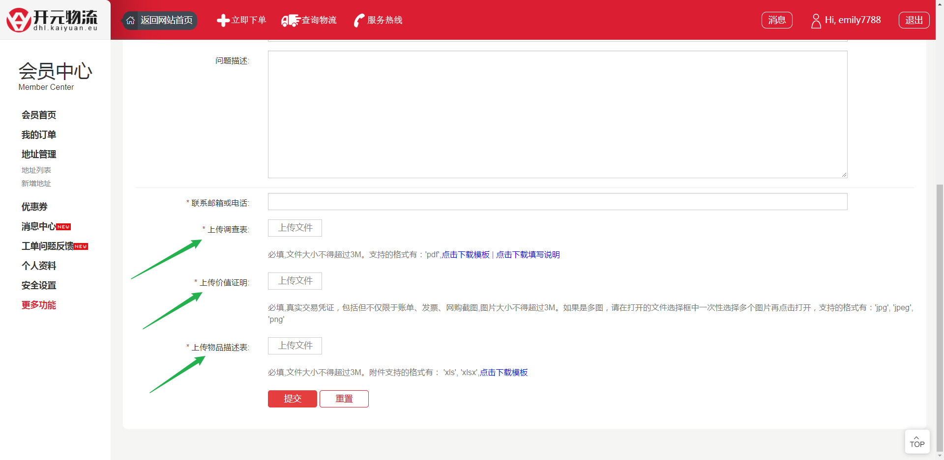 4. 需要上传3份文件(1. 调查表;2. 价值证明;3. 物品描述表);请按照实际填写后上传。