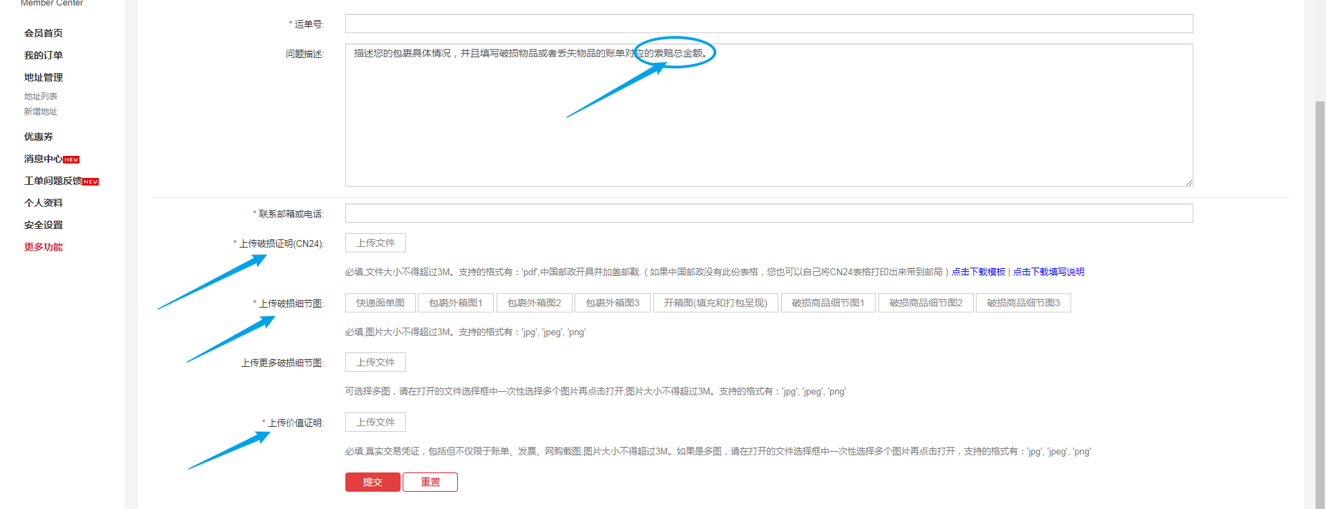 4) 索赔总金额:在“问题描述”告知我司 破损物品或者丢失物品的账单对应的索赔总金额。