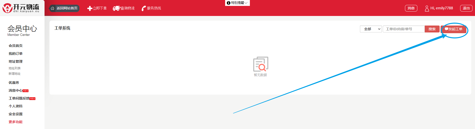 2. 点击“发起工单”;