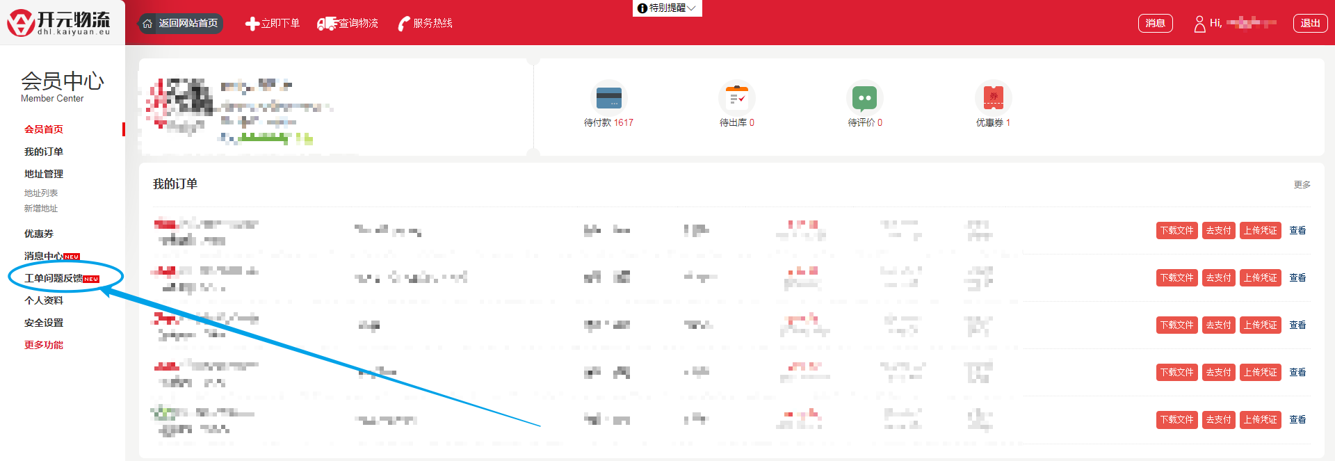 1. 登陆您的账号,打开“会员中心”,可看到如下页面。在左侧菜单栏找到“工单问题反馈”并点击;